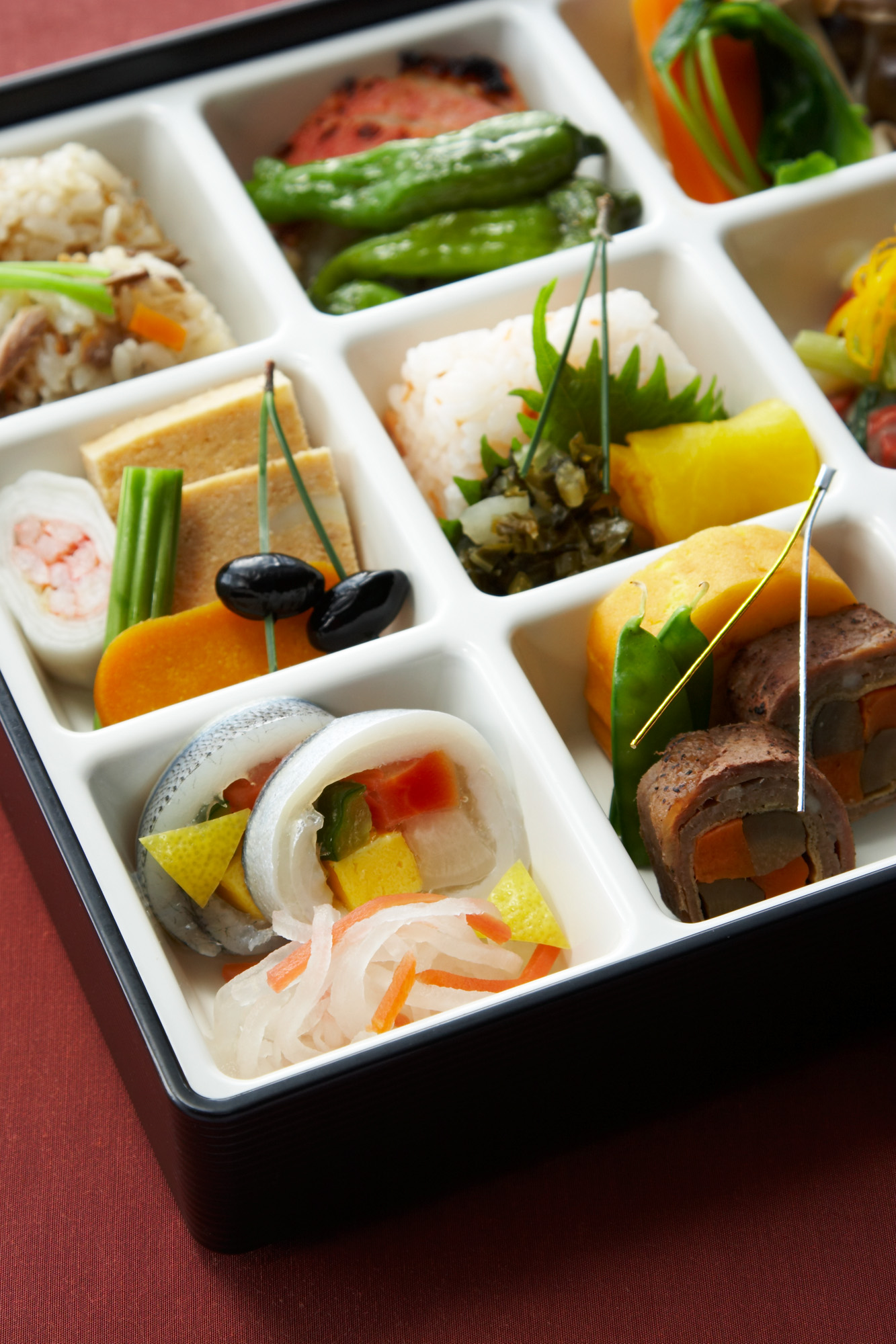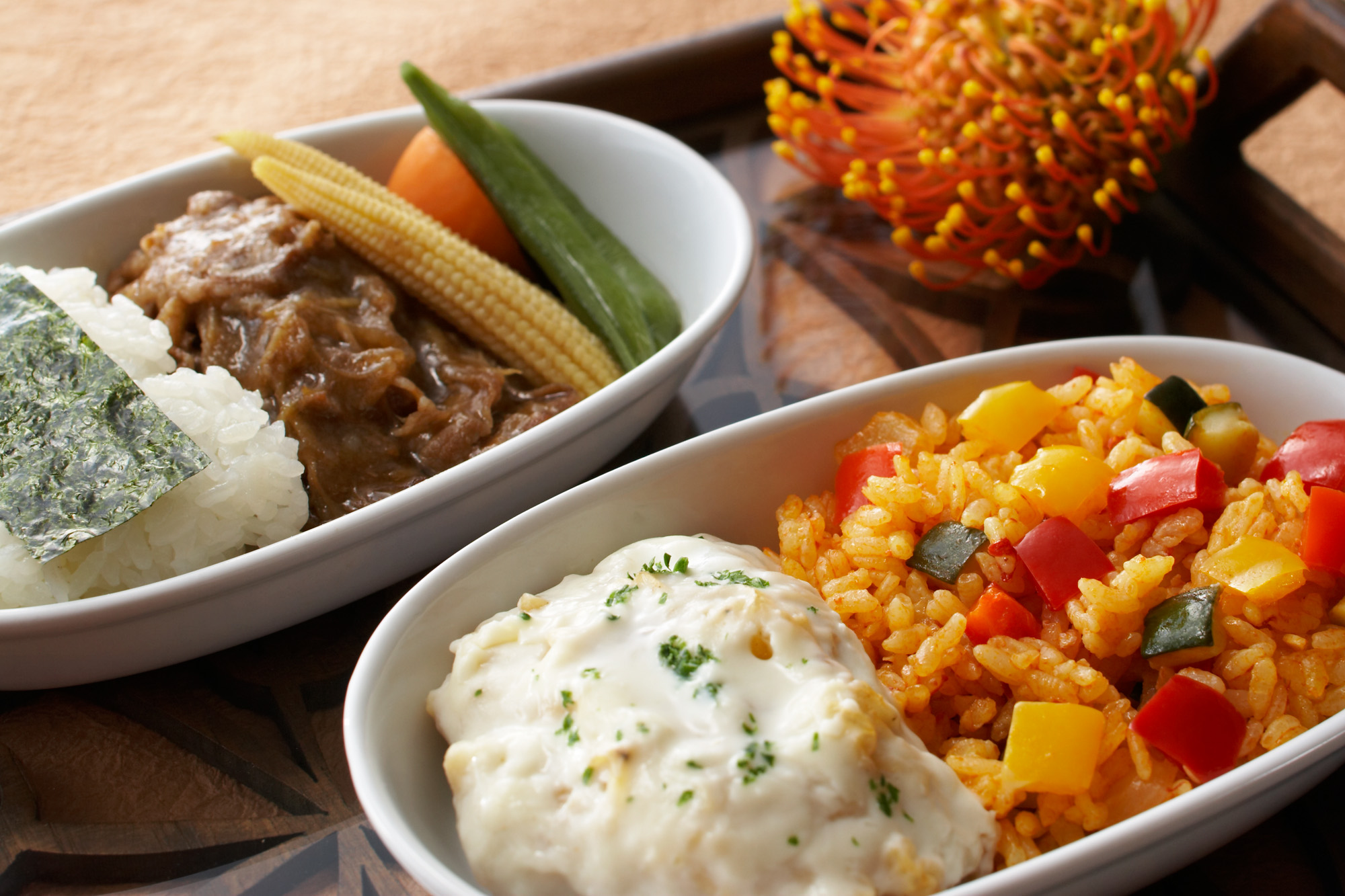 フードフォトシンガポール航空の赤のイメージを採用した機内食メニュー、お弁当写真撮影。